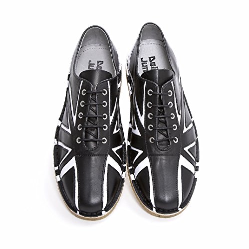 Tommy Union Jack Bowling shoe with a crepe sole by Delicious Junction Black and white leather upper Leather linings Authentic Real Crepe rubber sole - provides excellent underfoot comfort. Crepe is a natural material used for classic Mod Shoes since the 1950s.